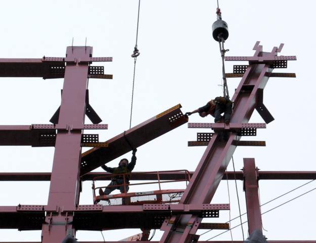 Setting the beams into place isn't for the faint of heart. As a crane lowers the beams, workers, in harnesses, guide the steel down as they stand on small beams and cables.