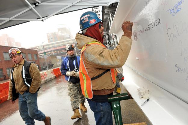 Queens Borough President Helen Marshall signs a beam for the tower.