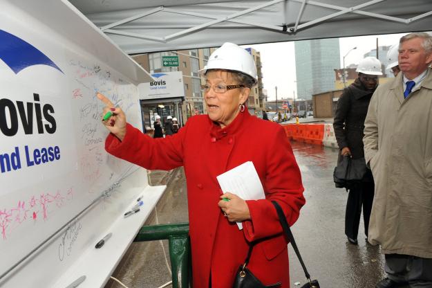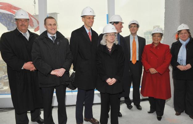 (l-r) Building & Construction Trades Council of Greater New York president Gary LaBarbera; Tishman Speyer president and co-CEO Rob Speyer; City Health Commissioner Dr. Thomas Farley; Deputy Mayor for Health & Human Services Linda Gibbs; Deputy Mayor for Economic Development Robert Lieber; Economic Development Corporation president Seth Pinsky; Queens Borough President Helen Marshall; and city Administrative Services Commissioner Martha Hirst.