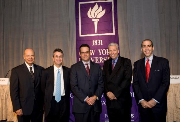 (l-r) NYU School of Continuing and Professional Studies Dean Robert Lapiner; Wachtell, Lipton, Rosen & Katz partner Robin Panovka; Simon Property Group chairman and CEO David Simon; NYU Schack Institute Divisional Dean James P. Stuckey; and Wachtell, Lipton, Rosen & Katz partner Adam O. Emmerich. The symposium, entitled "The Geometry of Recovery – Are REITs the Solution?,” was held at the Pierre Hotel on March 11.