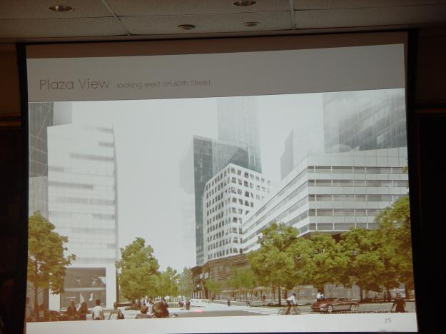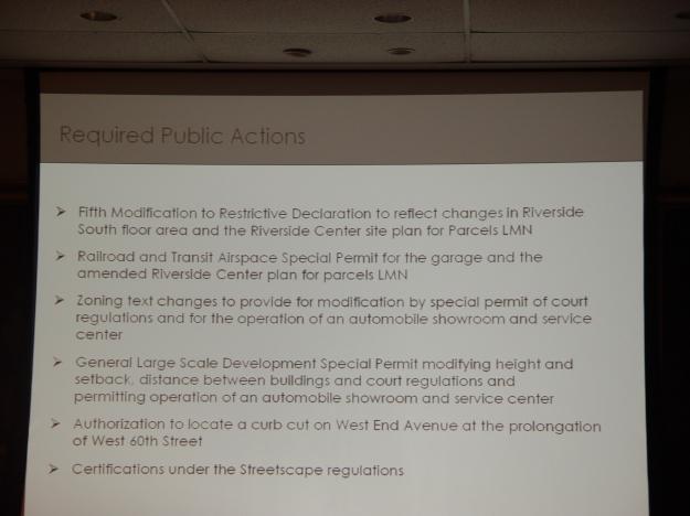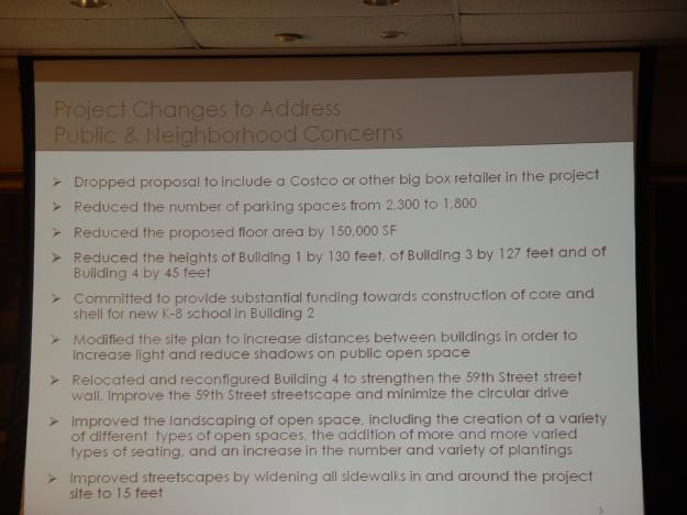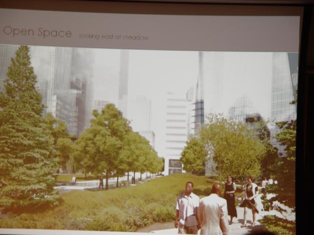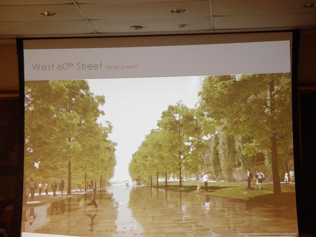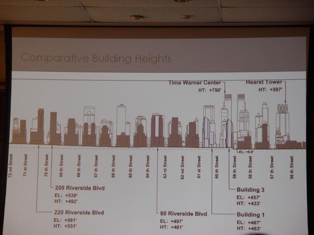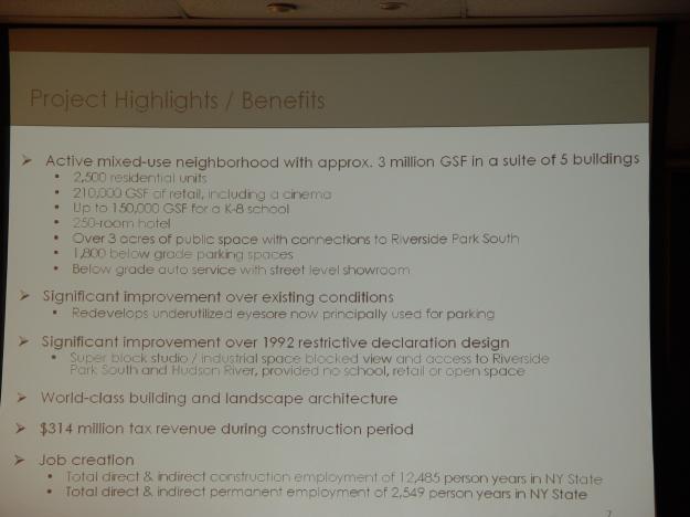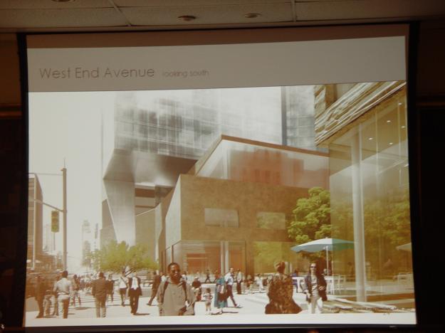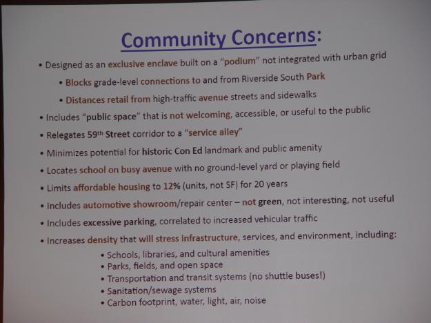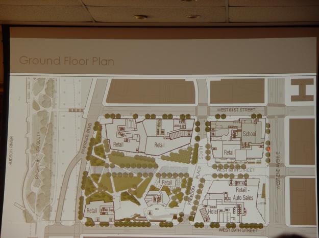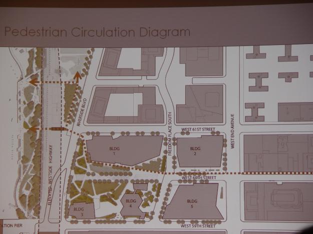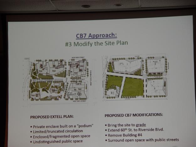 Ms. Wymore proposed that public space be lowered to street level, as portions of it are currently elevated. She also called for the removal of building no. 4 and extension of public streets into the Riverside complex. However, representatives of Extell said afterward that removal of a building and street extensions were highly unlikely.