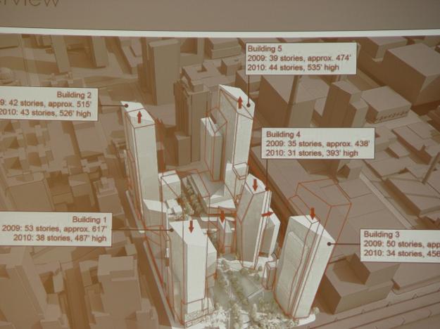Three of the buildings were decreased in height in the most recent version of the proposal, while the western two buildings were increased.