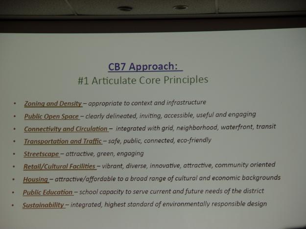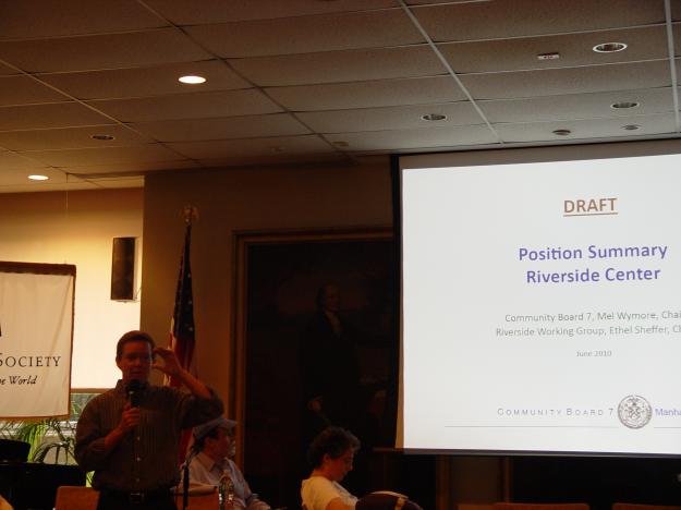 Community Board 7 chair Mel Wymore presented a draft of the board's position.