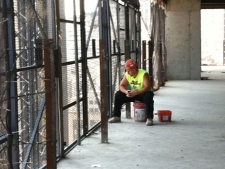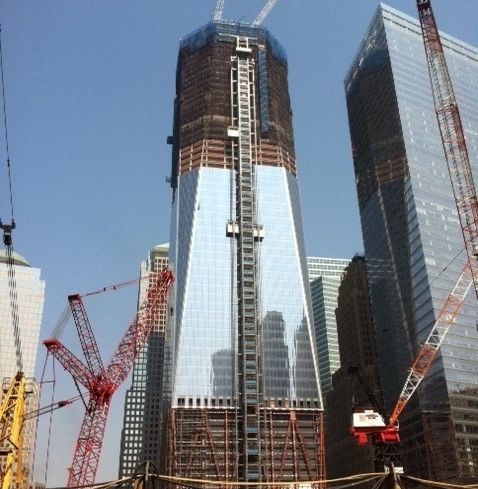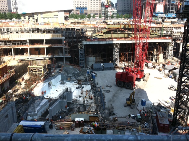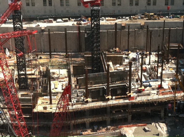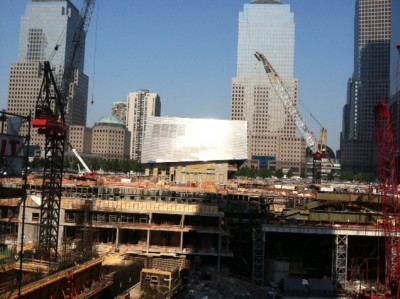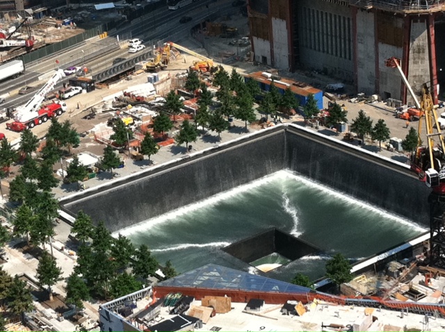 Eating bagels and sipping coffee, CBRE executives and reporters chatted while looking down upon an army of construction workers starting their morning at ground zero. The Silverstein offices offered a perfect view of the memorial fountain now located atop the South Tower’s original 1-acre footprint.