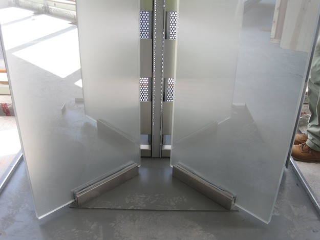 Previously, custom rolled panes were cut at different dimensions, each taking on a prismatic aspect that would refract the light in dynamic ways, according to SOM director and 1 WTC project director Kenneth Lewis. Now, the standardized panes will be affixed to a metal screen not unlike the one at 7 WTC. Starting with flush panels at the edges of the bases four sides, the panels will begin to open up in a V-pattern as they move toward the center of the plane, creating a pleated effect. From flat surfaces at the corners, the panes will open to as much as 60 degrees at the middle of the space.