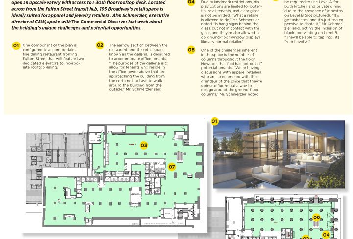 Marketed by Cushman & Wakefield, the majestic space will be divided for up to three tenants, including a restaurant, with whom brokers are now in discussions with to open an upscale eatery with access to a 30th floor rooftop deck. Located across from the Fulton Street transit hub, 195 Broadway’s retail space is ideally suited for apparel and jewelry retailers. Alan Schmerzler, executive director at C&W, spoke with The Commercial Observer last week about the building’s unique challenges and potential opportunities.