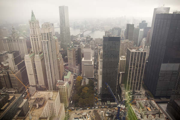 NEW YORK, NY -- OCTOBER 31, 2013: To the East, the Brooklyn Bridge and Frank Gehry's 8 Spruce Street are visible from the 63rd floor of 1 WTC. Photographer: Michael Nagle