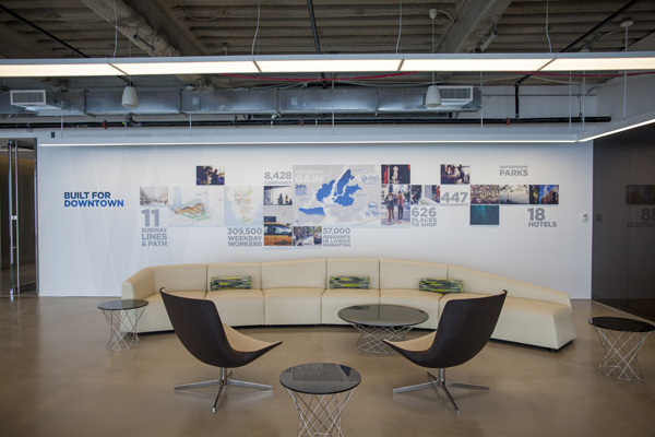 NEW YORK, NY -- OCTOBER 31, 2013: A display on the 63rd floor trumpets the advantages of being located in the Downtown market. Photographer: Michael Nagle