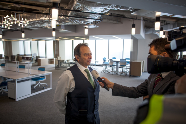 NEW YORK, NY -- OCTOBER 31, 2013: Journalists interview Douglas Durst during a tour of model office space on the 63rd floor of 1 World Trade Center. Photographer: Michael Nagle