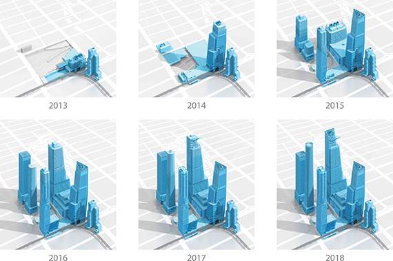 Related Companies has released a new visual for the construction timeline at Hudson Yards (at left) as well as a new video (below) as construction begins on the platform that will cover the rail yards.
