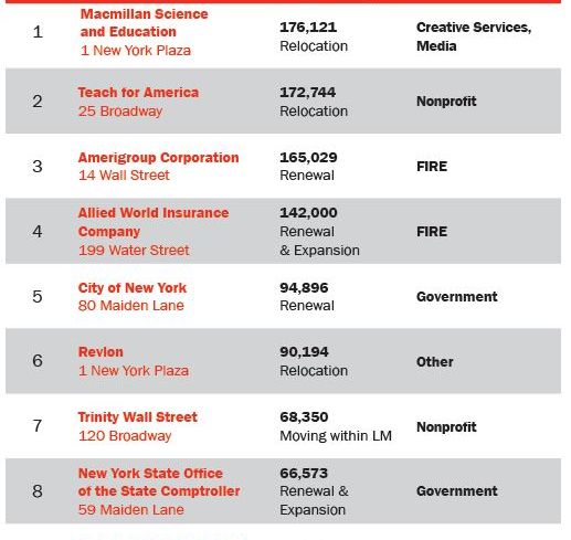 The third largest lease was Amerigroup‘s renewal at 14 Wall Street. The health insurer consolidated its offices in 165,029 square feet at 14 Wall Street in 2012, as CO previously reported.