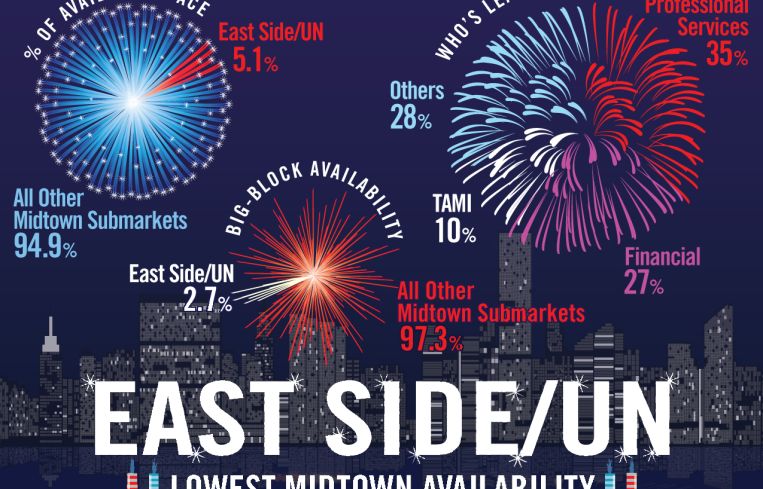 This Fourth of July, Macy’s 38th annual fireworks show is heading back to the East River for the first time in five years. In honor of this move, let’s take a look at the Midtown submarket that currently has the lowest availability rate, the East Side/United Nations. At 6.5 percent, the East Side/UN availability rate is 90 basis points lower than Midtown West/Columbus Circle—the submarket with the next lowest availability rate in Midtown. Additionally, the available supply in the East Side/UN submarket accounts for only 5.1 percent of the overall available space in Midtown.