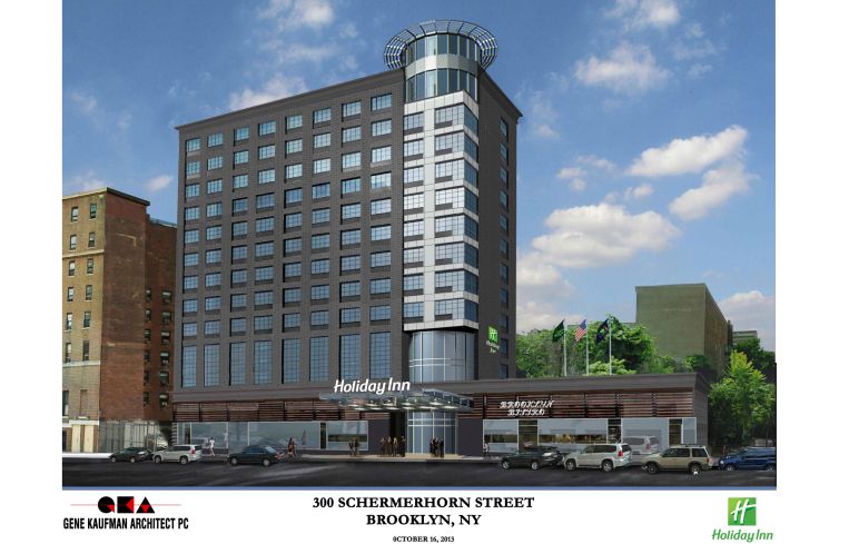 The $80 million 246-room Holiday Inn Brooklyn Nevins Station topped out yesterday at 300 Schermerhorn Street in Downtown Brooklyn. The Gene Kaufman Architect-designed hotel is slated to open in mid-2015.
