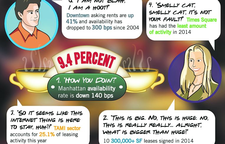 1. “How you doin’?” Joey Tribbiani, my loveable Italian brother, used this pickup line and it was the show’s most repeated catchphrase. So how is the Manhattan office market doin’? The availability rate is down 140 basis points, to 9.4 percent, this year. That’s its lowest level since September 2008. It also marks the largest eight-month decline during this recovery. I would say Manhattan is doin’ well.