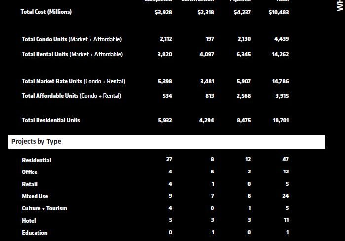 Of the 36 projects, the greatest number—12—are residential, accounting for 8,475 units, the report says. That’s in addition to 4,294 residential units that are already under construction in eight developments.