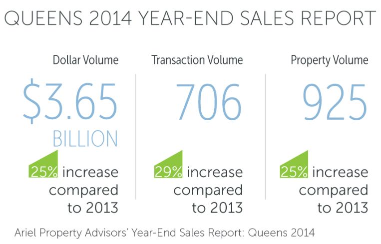 Investment property sales in Queens jumped to $3.65 billion in 2014, a year-over-year increase of 25 percent, according to an annual sales report by Ariel.