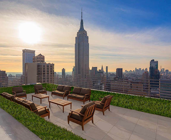 A penthouse suite with sweet views of the city is available for lease at Empire State Realty Trust’s 1400 Broadway with a rent of $75,515 per month.