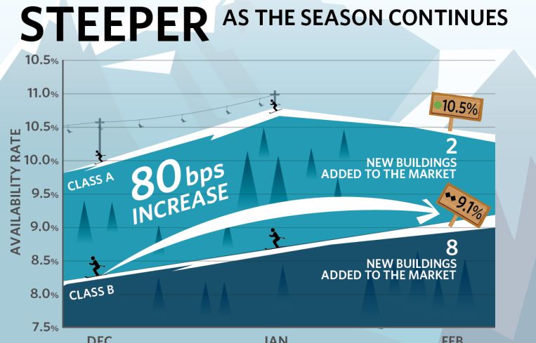 Despite the change in the Class B available supply, expect the additional Class B space to create more value opportunities for tenants. The 10 Class B spaces added to the market average an asking rent of $58.03 per square foot, substantially discounted to the 11 Class A spaces added to the market with an average of $71.03 per square foot.