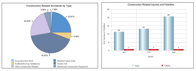 The number of construction-related accidents and injuries have increased this year as have fatalities, according to new data released for the first three months of the year by the city’s Department of Buildings. Accidents (which can include multiple injuries and/or fatalities) and injuries have each climbed to 72, from 46 and 54, respectively.