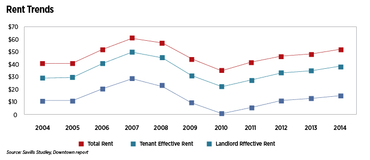 The increase was an 8.5 percent jump from the 2013 total rent at $47.59 per square foot, according to the brokerage’s Downtown report. Rents in Downtown remain well above the national average of $44.37 per square foot.