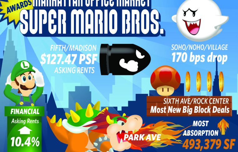 1. The Bowser Award. This baddy breathes fireballs and captures the Princess in almost every version of the game. This award goes to the Park Avenue submarket for being on fire and having the most positive absorption year-to-date with 493,379 square feet. This submarket is the only one in Manhattan this year to post positive absorption all six months.