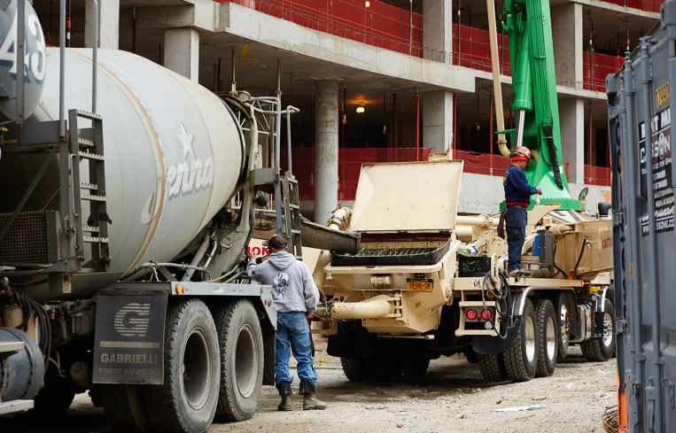 It’s 7:30 a.m. at Frederick Douglass Circle, just above the northwest corner of Central Park. Construction vehicles of all types line West 110th Street, awaiting the green lights to send them to Harlem’s many works-in-progress. A flatbed carrying wood pallets heads west. A pick-up carrying plumbers follows. A spinning concrete mixer—Jenna #43—backs into 2040 Fredrick Douglass Boulevard carrying 11 of the 200 cubic yards, requested for today’s work (concrete is measured by volume—one cubic yard weighs about 4,000 pounds). Trucks #21 and #54 are behind, staggered, each carrying more of the concrete mixed at the batch plant in the Bronx. This parade will continue all day, timed to sync with the pace of the concrete finishers placing the mix.