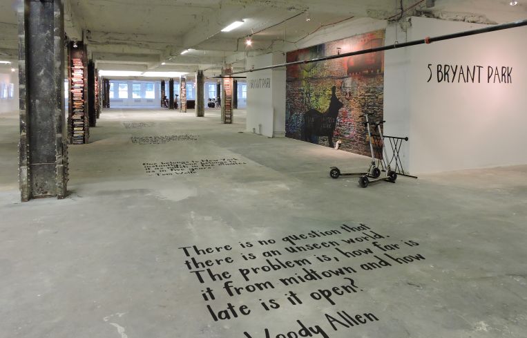 On the raw concrete floor, it added quotes about New York City from celebrities ranging from Woody Allen to members of the Beastie Boys. The walkway of words is reminiscent of Library Way, the pathway of quotes on East 41st Street that leads to the NYPL main branch. The statements inscripted in 5 Bryant Park lead to the windows along Avenue of the Americas and views of Bryant Park.