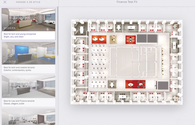 The way it works is as follows: A landlord uploads a floor plan in CAD or PDF form onto the platform. You then pick from space concepts, like conference room, desks, offices and breakout space. Then you select a 3D style template like “luxe” for law firms and finance companies or “eclectic” for tech and creative tenants. Protofit 3D then spits out a 3D model which includes Floored’s pre-selected finishes, furniture, ceilings and floor types.