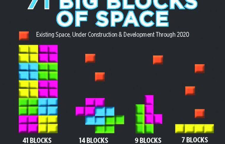 There are currently 60 existing big blocks of available space on the market greater than 100,000 square feet. These 60 large spaces account for over 18.5 million square feet of available space. The amount of available space increases to 29.5 million square feet with the addition of 11 blocks of space from buildings currently under construction and/or proposed to be completed by 2020.