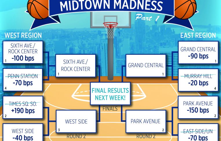With the Elite 8 Midtown submarkets seeded by total market size, the first round will be decided by the largest basis point vacancy change. In the East region, the No. 1-seeded Grand Central had a 90-basis-point drop in vacancy to 10.6 percent in the past year and easily defeats No. 4-seeded Murray Hill where vacancy only dipped 20 basis points to 6.8 percent. In the other East region contest, No. 2-seeded Park Avenue had the largest vacancy decline in the first round with a 150-basis-point decline to 10.1 percent, crushing the East Side/U.N. submarket where the vacancy rate is up 70 basis points to 5.9 percent since last year.