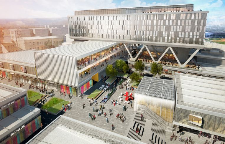 The entire project includes a 190-room hotel, a 1,250-space parking garage, and a 40,000-square-foot food hall. There will be 40 or 50 dining options at the property, as CO reported, including a Mighty Quinn’s Barbecue.