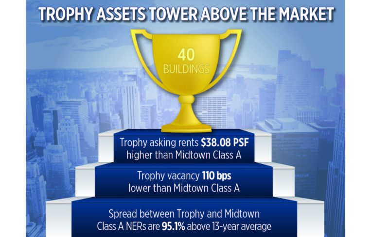 Trophy net effective rents are significantly higher than Midtown Class A as well. Through the first quarter of 2016, net effective rents for trophy assets averaged $107.13 per square foot, a $41.64 premium over the Midtown Class A average. This premium is 95.1 percent higher than the historical $21.34 per square foot average spread between the trophy set and Midtown Class A net effective rents.