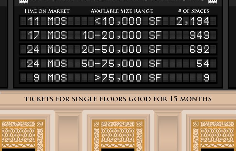 Despite single-floor availabilities less than 10,000 square feet accounting for 56.3 percent of the total spaces, these availabilities remain on the market less than a year, averaging 11 months. If only our own time away could last that long!