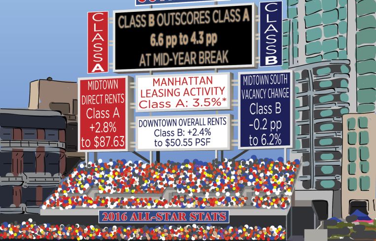 Headed into the last inning, these runs will be based on new leasing activity through mid-year 2016 as a percentage for Manhattan Class A and Class B total inventory. More than 8.8 million square feet of new leases were completed for Manhattan Class A, which accounts for 3.5 percent of the Class A inventory. Class B had 3.1 million square feet of new leases signed this year, which accounts for 3.2 percent of the Class B inventory.