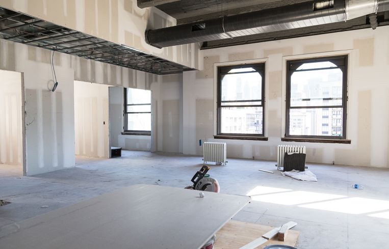 Essential Design + Build has already stripped the plaster from columns, exposing terra-cotta-covered steel beams. New interior trims were installed on the office’s windows, which were all cleaned along with the three skylights. The radiators in the office space were refurbished as well.