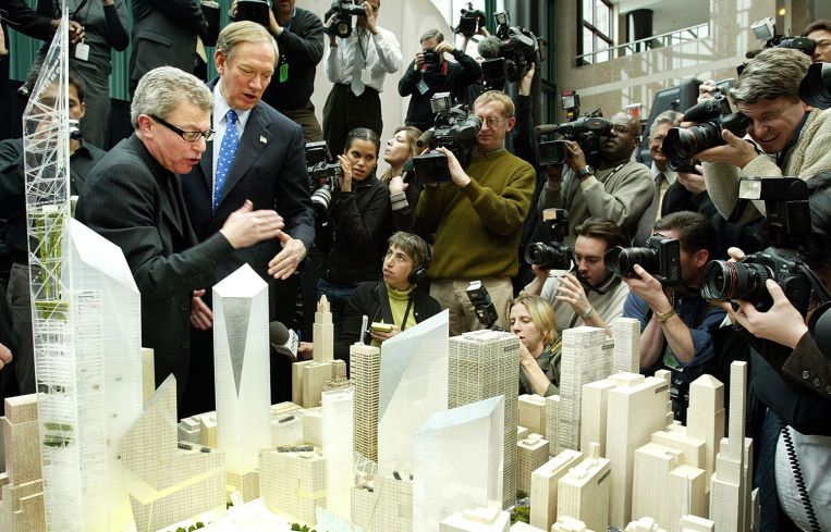 At a December presentation at the Winter Garden (now part of Brookfield Place) across the street from Ground Zero, Polish-American architect Daniel Libeskind unveiled what would become the winning bid for the project. The plan called for a memorial, a museum, a reintroduction of Fulton and Greenwich Streets and a series of buildings whose centerpiece would be a 1,776-foot tower. Although Silverstein Properties executives had hired David Childs of SOM to design its properties, the company embraced the master plan. (Gov. George Pataki would later name the tallest building—1 WTC—the “Freedom Tower,” a name that received mixed responses and was later abandoned.)