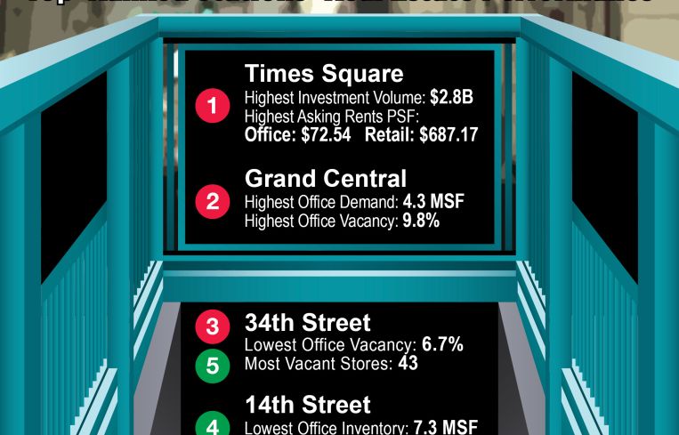 Not only does this subway station see the most riders pass through its turnstile; it also has the highest average office and retail asking rents and the highest investment dollar volume over the past 12 months. In the area around the Times Square station, six office buildings were sold totaling $2.8 billion—more than the other three areas combined. Office asking rents average $72.54 per square foot, while retail asking rents are $687.17 per square foot ranging between $85 and $2,500 a foot.