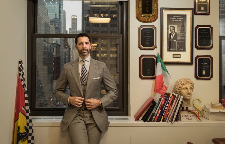 One of the more offbeat things he took away from his year in India was a love for Formula One racing (hey, you have to watch something on TV). In his current office suite on the eighth floor of 315 Madison Avenue overlooking Grand Central Terminal and the upcoming One Vanderbilt, his wall has a roughly 3-foot-high Formula One Fiat car painting, and there are model Ferraris and pictures of him with Formula One race car drivers on the same bookshelves that contain pictures of his wife and 7-year-old daughter, Sofia.