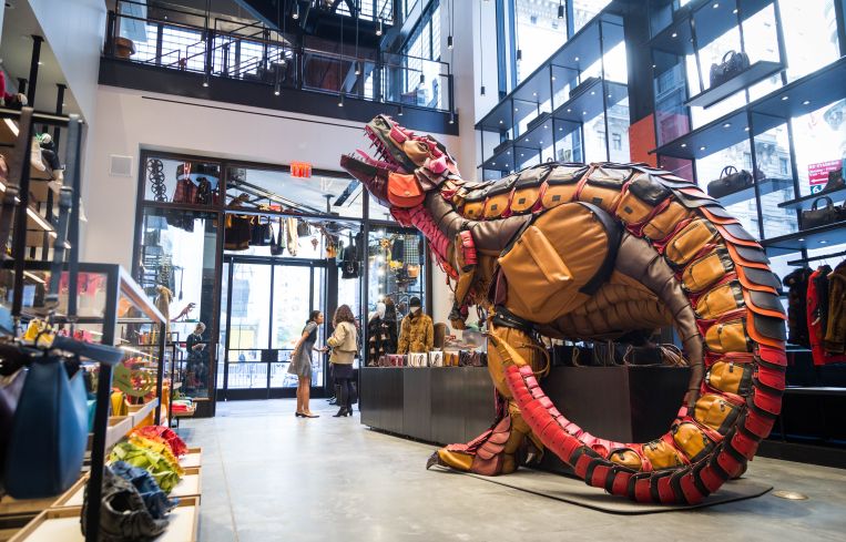 One. First, let us start with the elephant in the room. Or, as the case may be, the dinosaur in the room. A major centerpiece of the ground floor is Rexy, a 12-foot dinosaur. Artist Billie Achilleos created this towering leather sculpture from 400 bags. “From beginning to end, it was a nine-month process to create Rexy,” explained Vevers. But almost as impressive, Achilleos didn’t use any specially made bags for the process; it was all pure Coach.