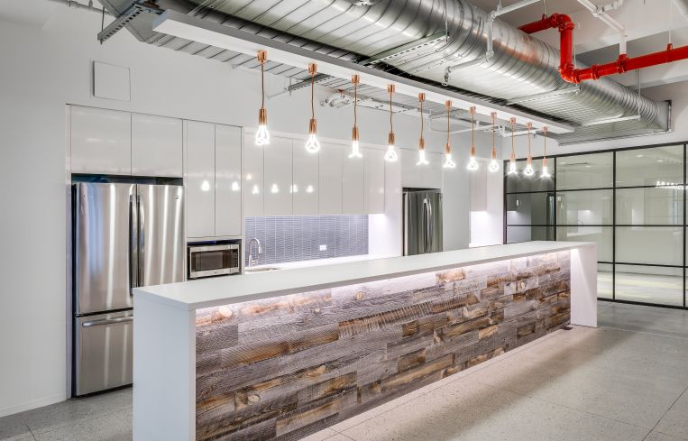 During demolition of the eighth and 10th floors, JEMB revealed and refreshed the original concrete floors, which were installed when the building was constructed in the 1920s. They brought in custom copper-strung lights in the pantry and added recessed lighting in the ceiling to brighten the space more. And the prebuilt spaces come with private glassed sections that can be transformed into conference rooms, break rooms or private offices, depending on the tenant’s preference. JEMB also stripped down most of the columns to just steel beams, except for ones that hold mechanical systems in the building, which BAI Architecture Group and JEMB decided to decorate with reclaimed wood.
