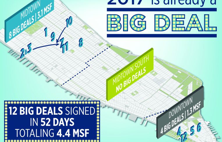 Downtown had a fantastic start to the year with three new big leases signed in less than two months—equal to the year-end 2016 total. Combined, the three new leases total over 850,000 square feet, 11.4 percent higher than Downtown’s overall new leasing activity through the first two months of last year. Spotify highlights the list with its relocation from Midtown South to 378,819 square feet at 4 World Trade Center. Midtown South comes up short to start 2017, with no large leases signed yet, but it’s no big deal since there are only six available blocks greater than 100,000 square feet, and in 2016, three large leases were signed as off-market deals.