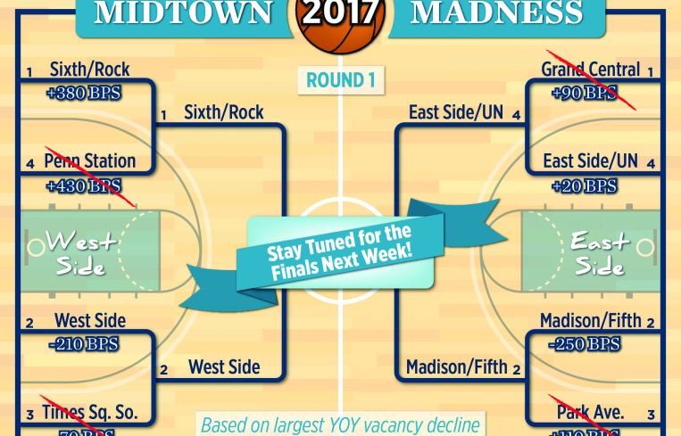 The first round of the tournament will be decided by largest year-over-year decline in vacancy, and each submarket will be seeded in its region by total inventory size. The Elite Eight starts off in the east region, as the No. 1-seeded Grand Central is off to a slow start, with a vacancy increase of 90 basis points to 11.5 percent. This allows the number four-seeded East Side/U.N. to score an easy first-round upset. Despite vacancy rising in the East Side/U.N. submarket as well, its increase was only 20 basis points to 6.1 percent. The No. 2-seeded Madison/Fifth submarket comes out strong in the first round, with a 250-basis-point drop to 10.8 percent, which is too difficult for Park Avenue to respond to this year. Park Avenue loses its bid to repeat as champion, as its vacancy increased 110 basis points to 11.2 percent.