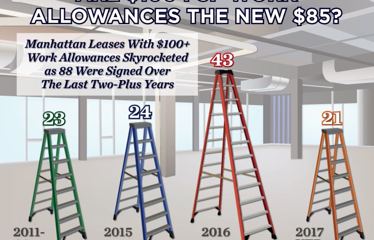 The increase in $100 per square foot tenant improvement allowances is partially due to an increase in construction costs. In October 2016, construction costs in New York were up 4.1 percent year-over-year, according to a fourth-quarter report issued by Rider Levett Bucknall, a construction advisory firm. In addition, landlords throughout Midtown continue to make compelling concession packages to retain and capture tenants to compete with new office development projects on the Far West Side and Downtown.