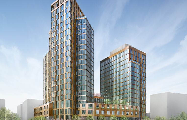 While the full buildout of Durst’s $1.5 billion development won’t be complete until 2023, the first building—which will have 81 affordable units—will be finished in the summer of 2018. Designed by Dattner Architects, the building at 26-01 First Street will be split into two towers and clad in a mix of glass and copper-hued metal paneling. A 24,000-square-foot Brooklyn Harvest Market will anchor the ground floor, bringing the Dursts a tax break and a valuable amenity to the neighborhood. (So far, Dattner Architects designed the master plan for the projects as well as Buildings 1 and 7; Davis Brody Bond is designing Buildings 2 and 3; the remaining three buildings have not been assigned an architect yet.)