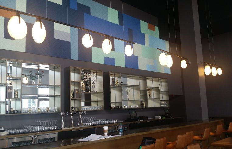 Once inside towards the right is JD’s Place, a bar serving premium liquor, eight craft cocktails and light fare (caesar salad, hummus plate, fish and chips and pulled pork sliders). The design includes a bronze-clad bar, walnut high-top bar tables and leather seats. The light fixtures all come from Rich Brilliant Willing, a lighting design manufacturer based on Greene Street. And hanging behind the bar is an acoustical mural from Baux in Sweden.