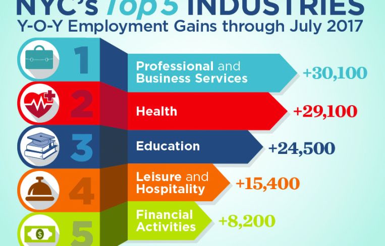 New York City continues to add jobs to the workforce, increasing employment by 106,800 jobs year-over-year through July. The city added to its record level of employment with total jobs exceeding 4.4 million. Job growth was stronger compared to a year prior, as only 87,300 jobs were added from July 2015 through July 2016. With job creation healthy, let’s review the top five industries to post the most significant employment gains over the last 12 months.
