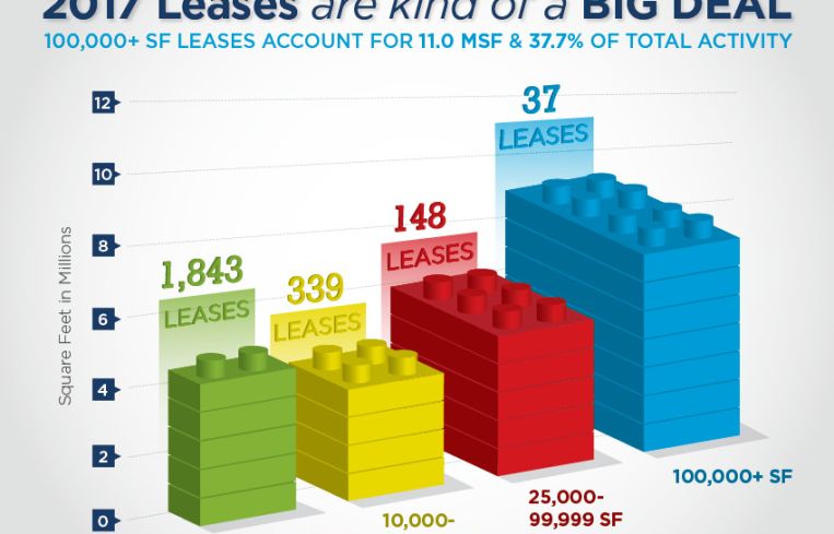 These 37 transactions total 11 million square feet and account for 37.7 percent of the total square footage leased this year. From 2014 through 2016, leases exceeding 100,000 square feet averaged only 29.5 percent of the square footage leased. Demand for smaller leases does not stack up to previous years, as deals below 100,000 square feet account for only 62.3 percent of the square footage leased this year, compared with the 70.5 percent average from 2014 through 2016.