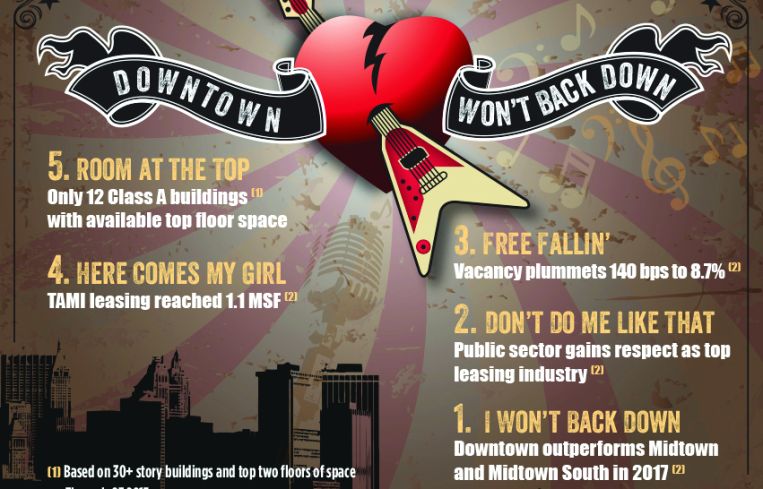 4. Here Comes My Girl. Yes, TAMI (tech, advertising, media and information services) came Downtown in full force this year with nearly 1.1 million square feet of new leases greater than 10,000 square feet signed and is on pace to surpass 2015 and 2016 totals combined.
