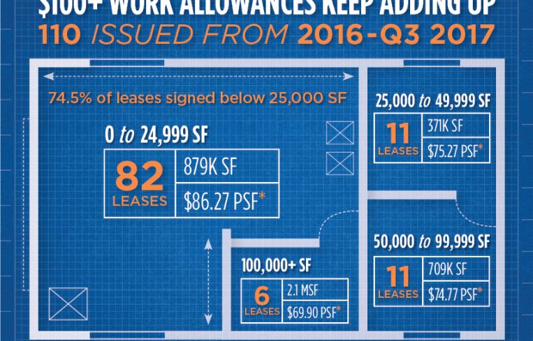 Earlier this year, I wrote about the $100-plus work allowance trend, and highlighted how more money was being offered by landlords for tenants to build out their spaces than ever before. Through the first three quarters of 2017, there were 66 leases signed with $100-plus work allowances and 110 since the start of 2016. This equates to 30.4 percent of new leases tracked with known tenant improvements over the past 21 months and is clearly a growing trend. Let’s examine how these 110 leases with $100-plus work allowances break down.