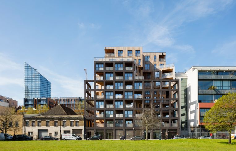 The cross-laminated timber (CLT) panels that clad the building were produced in Unternberg, Austria, by CLT manufacturing firm Binderholz, which used digital 3D modeling tools to design and cut the panels, rehearsed how they would be put together onsite in London and then determined the sequence in which they would be shipped across the continent.